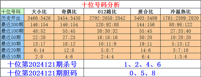 近期个位质数号码走冷,目前轮空1期,本期防质数号码回补;近期该位小号出现相对较少,目前连续轮空2期,本期预计小号回补。个位杀号:0147,胆码关注:268。