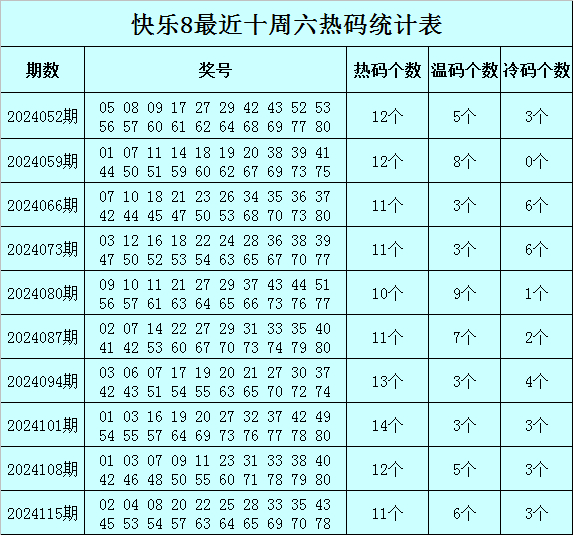 福彩快乐8第2024115期(上周六)开奖回顾:02 04 08 20 22 25 28 33 35 43 45 53 54 57 63 64 65 69 70 78,其中奖号遗漏总值为75,冷温热码比为3:6:11。