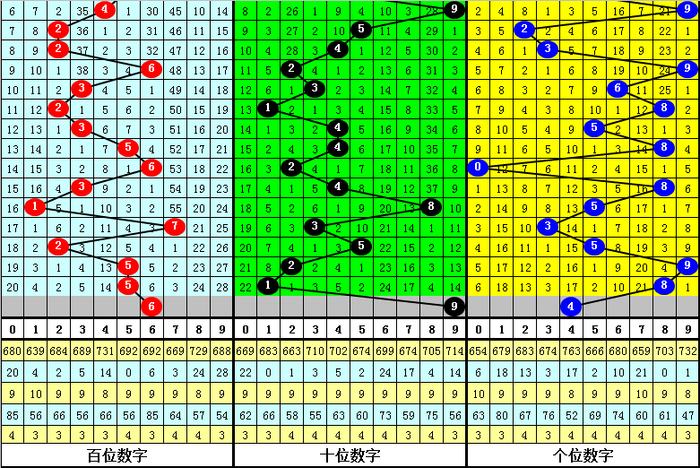 百位分析:该位上期奖号为5,出现2路、奇数、大号,在前11期奖号,该位012路比为4:2:5,1路号码走冷,目前012路号码遗漏期数分别为5、3和0,近期百位注意0路号码走热。