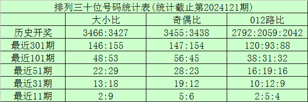 在连续11期奖号中,该位012路比为2:5:4,0路号码走冷,目前012路号码遗漏期数分别是:3期、0期和1期,本期预计出现0路奖号。