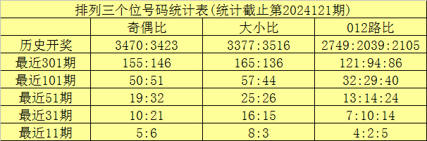 在连续11期奖号中,该位奇偶比为5:6,奇数出现较少,本期适当关注奇数回补;
