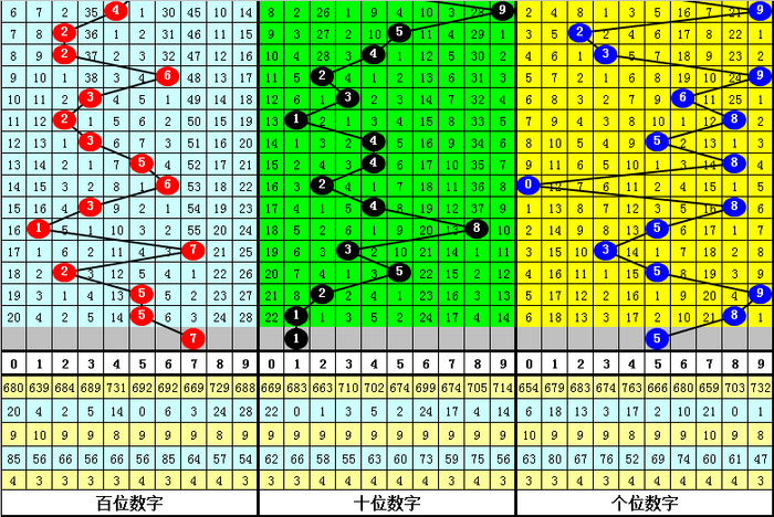 大中小分析:在组选0-9号码分布图中,前10期小号(0-2区段)出现8枚奖号,中号(3-6区段)出现15枚奖号,大号(7-9区段)出现7枚奖号,上期大中小区间分别出现1枚奖号,本期预计大中小区域各出1枚奖号。