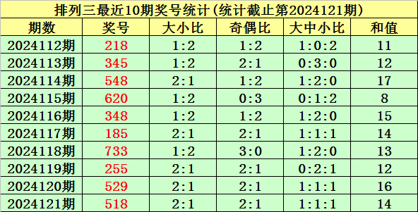 上期回顾:排列三第2024121期奖号为:518。奖号类型:组六,和值:14,奇偶比:2:1,跨度:7,大小比:2:1。
