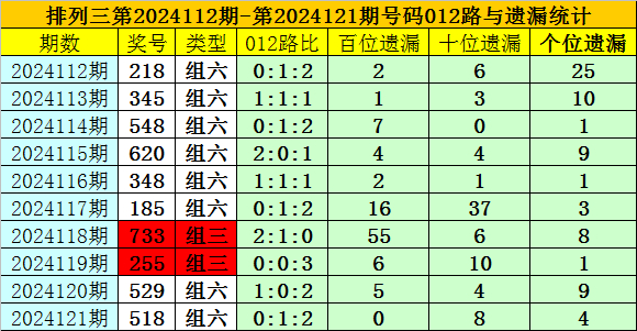 开奖回顾:排列三第2024121期奖号为:518,类型为组六,号码012路比为0:1:2,百十个位号码直选分别遗漏0期、8期和4期。