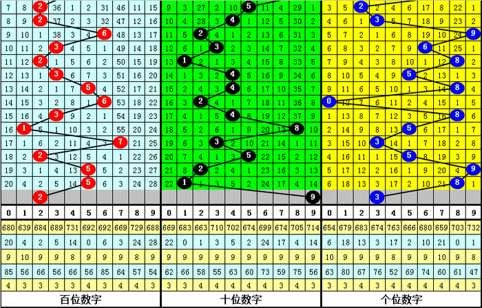 目前百位最冷号码为9,当前遗漏28期,该号码历史最大遗漏为54期,本期百位防号码9解冻。