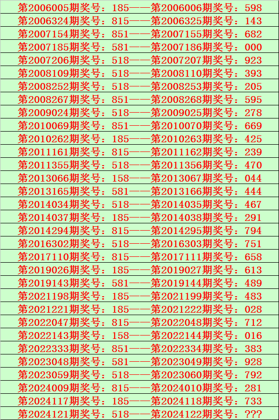开奖回顾:体彩排列三第2024121期奖号为:518,类型:组六。