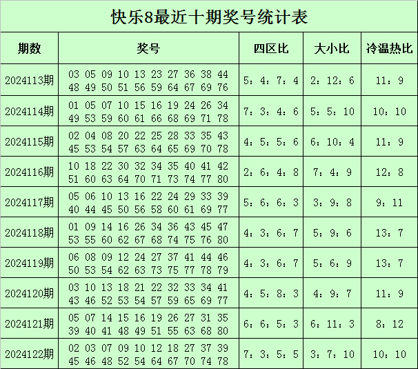 福彩快乐8第2024122期开奖回顾:02 03 07 09 10 12 18 27 37 39 45 46 48 52 54 64 67 70 74 78,其中奖号四区比为7:3:5:5,冷温热码比为3:7:10,大小比为10:10,和值为762,同尾号码为10 70、02 12 52、54 64 74、07 27 37 67、18 48 78、09 39。