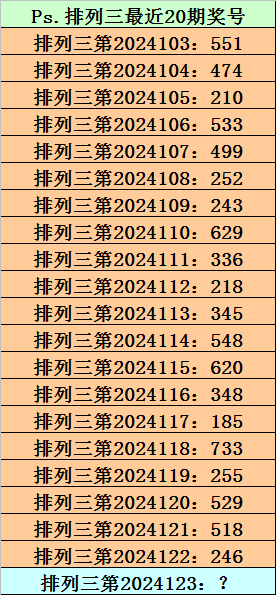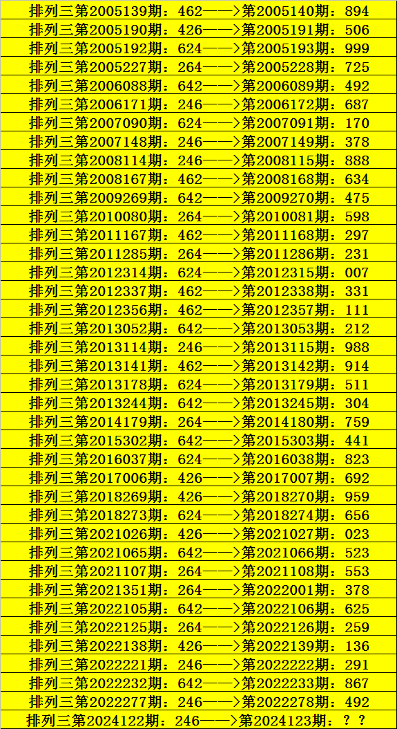 第2024122期排列三奖号为246,历史上该号码组选开出39次,下期奖号分别为:894、506、999、725、492、687、170、378、888、634、475、598、297、231、007、331、111、212、988、914、511、304、759、441、823、692、959、656、023、523、553、378、625、259、136、291、867、492。