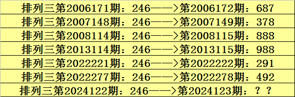 第2024122期排列三奖号为246,历史上该号码直选出现7次,下期奖号分别为:687、378、888、988、291、492。
