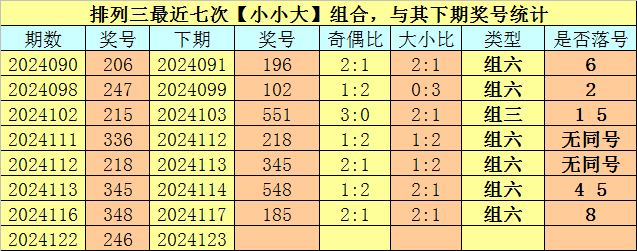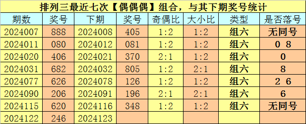 奖号类型分析:排列三最近七次【小小大】组合与【偶偶偶】组合出现之后,其下期组三号码开出1次,组六号码开出13次,其中组六号码开出频率非常热,本期预计继续开出组六号码。另外,其下期开奖有10期奖号包含了重号,本期预计继续开出重号,参考号码4。