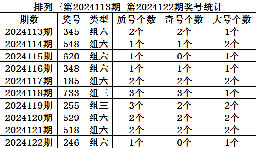 上期回顾:排列三第2024122期开奖:246,质合比为1:2,奇偶比为1:2,大小比为0:3。