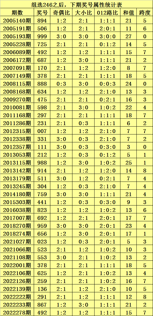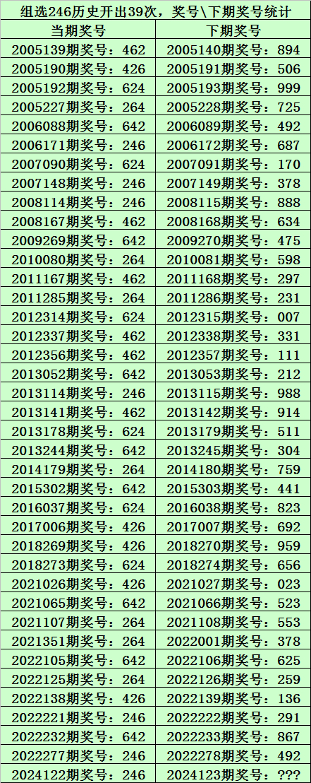 二、组选246分析:排列三历史上已开出39次组选号码246了,其奖号和下期开出奖号统计如下: