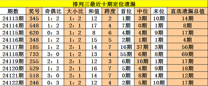 开奖回顾:排列三第2024122期奖号:246,定位直选遗漏值2期、5期、10期,遗漏总值为17期。