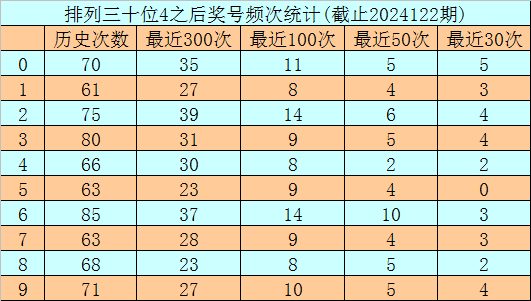 第二位杀号:第二位上期开出奖号为4,该位历史上奖号4开出了703次,最近100次第二位奖号出现4后,下期落号0-9次数从高到低分别为:号码6、2→14次,0→11次,9→10次,3、5、7→9次,1、4、8→8次。
