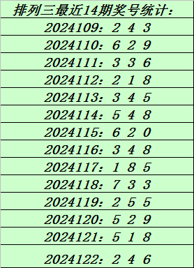 上期回顾:排列三第2024122期奖号:246。和值12,跨度4。