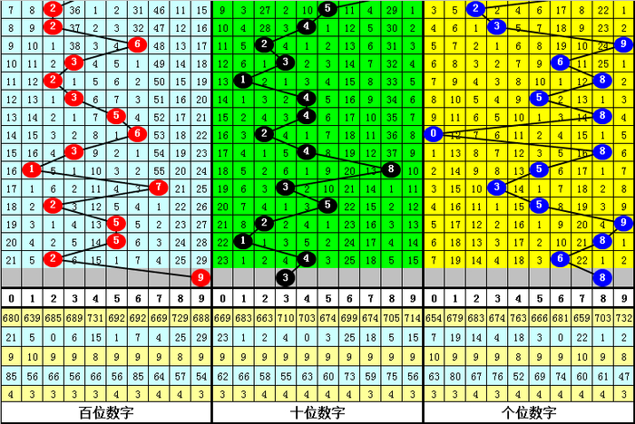 3、在以上0-9号码频次中,号码012路比为32:12:21,奇偶比为32:33,本期预计百位开出奇数号码,参考号码9。