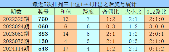 1、最近两期排列三十位号码开出号码分别为1和4,历史上十位号码连续两期同时出现号码1和4的奖号共开出75期。最近五次下期开出号码为:760、060、383、130、548;