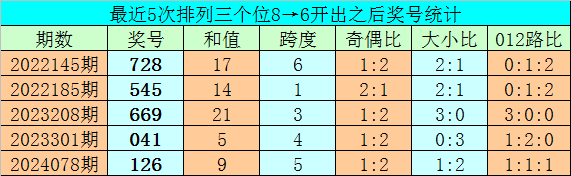 1、排列三前两期个位分别开出号码8和6,历史上个位号码连续两期分别出现8和6时,共有66次。在最近5次出现时,其下期分别出现号码:728、545、669、041、126;