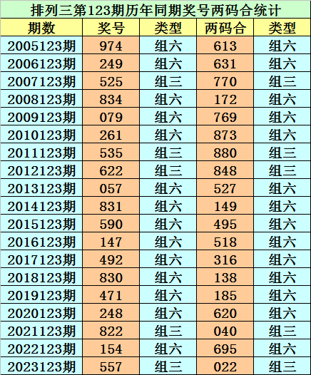 排列三从2004年开奖至今已开出6894期奖号了,其中第123期历史同期奖号出现19次,历年第123期分别开出号码:974、249、525、834、079、261、535、622、057、831、590、147、492、830、471、248、822、154、557。