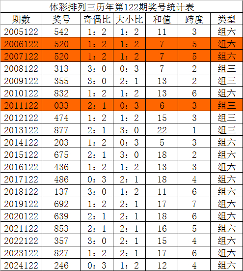 排列三第2024122期奖号为246,奇偶比为0:3,大小比为1:2,和值为12,跨度为4。