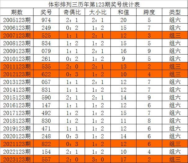 在历年排列三第123期开奖中:组三号码出现5次,组六号码出现14次。组六号码出现比例略高,本期奖号形态参考:组六号码。