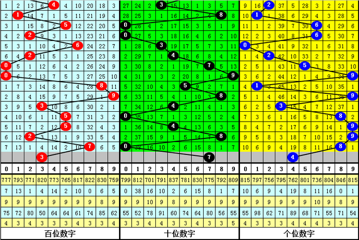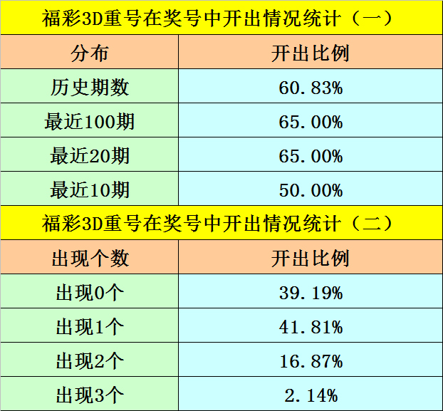 最近100期开奖中,含有重号的奖号有65期,最近20期含有重号的奖号有13期,最近10期含有重号的奖号有5期。本期注意重号落号。