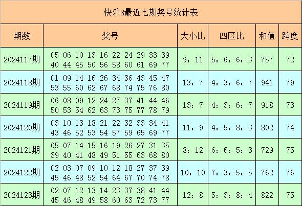 福彩快乐8第2024123期开出奖号:02 07 12 13 14 23 37 38 41 44 45 46 48 49 58 60 63 72 73 77,其中奖号大小比为12:8,四区比为5:3:8:4,和值为822,跨度为75。