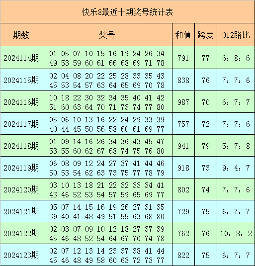 快乐8第2024123期奖号为:02 07 12 13 14 23 37 38 41 44 45 46 48 49 58 60 63 72 73 77,其中奖号012路比为6:7:7,和值为822,跨度为75。