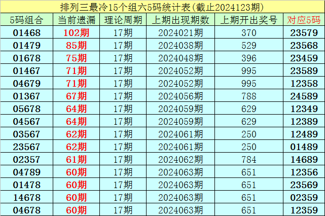 (5)排列三目前遗漏值最大的5码组六组合为:01468,本期遗漏102期,短期解冻的可能性较小,则24124期奖号分布在01468-23579之中的可能性最大。