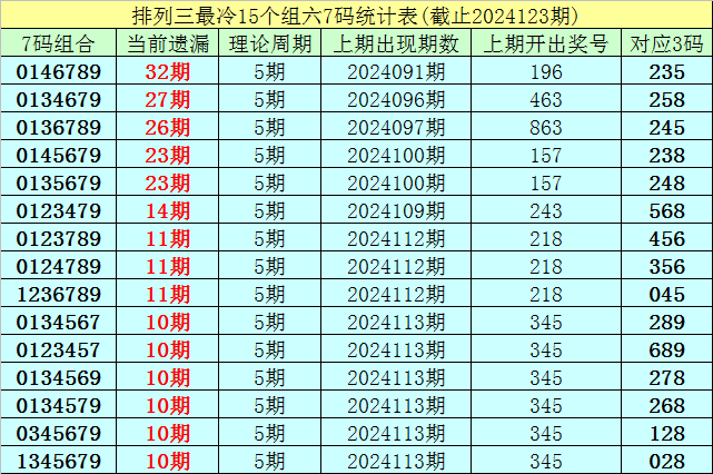 (1)在排列三已开出的6895期奖号中(统计截止第2024123期),目前7码组六遗漏值最大的组合为:0146789,本期遗漏32期;
