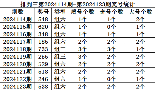 上期回顾:排列三第2024123期开奖:538,质合比为2:1,奇偶比为2:1,大小比为2:1。