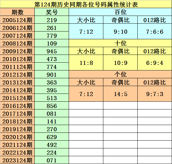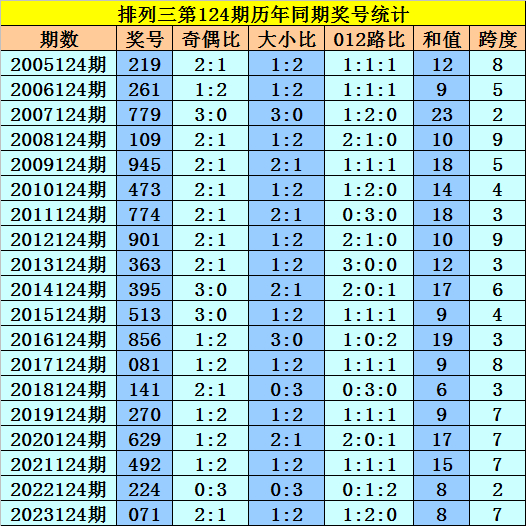 开奖回顾:排列三第2024123期开出奖号538,奖号012路比为1:0:2,大小比为2:1,奇偶比为2:1,最近三年第124期同期开出奖号为:第2021124期:492、第2022124期:224、第2023124期:071。