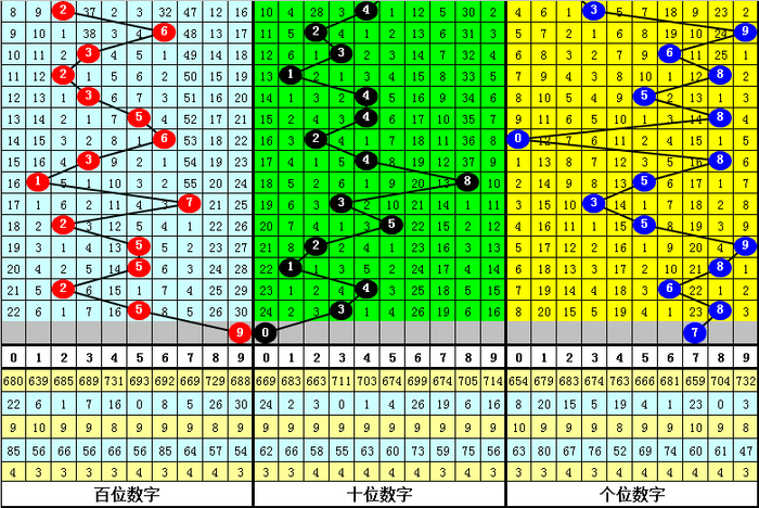 第124期历史同期开奖中,百位号码振幅分别为:0-5-6-8-5-3-2-6-0-2-3-8-1-1-4-2-2-2,波动范围在0-9之间,012路号码比例开出7:6:6,大小号码比例开出7:12,奇偶号码比例开出9:10,本期看好百位出现大号,胆码参考9。