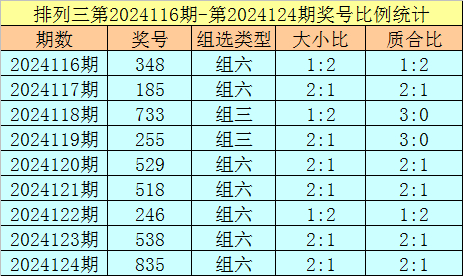 上期回顾:排列三第2024124奖号开出835,奖号质合比为2:1,大小比为2:1,跨度为5,类型为组六。