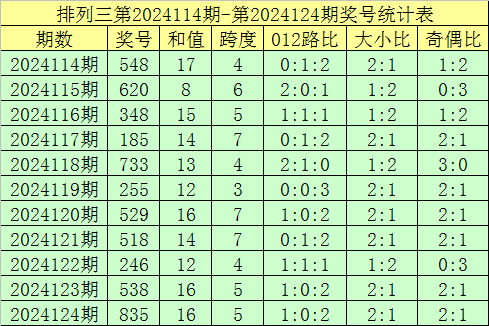 开奖回顾:排列三第2024124期奖号开出:835,组选类型:组六,大小比为2:1,奇偶比为2:1,和值为16,跨度为5。