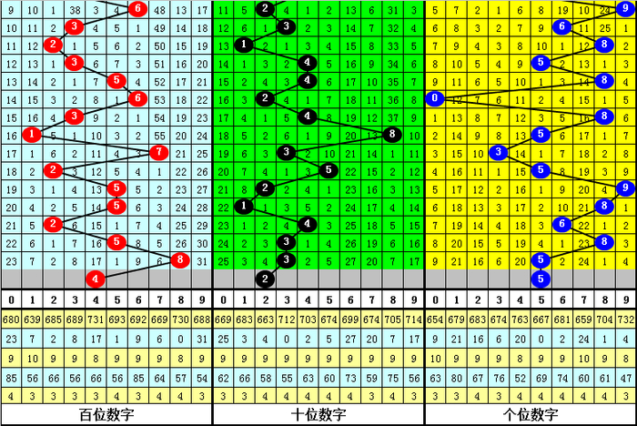二、在最近22期开奖中,奖号:5、2、3、8,开出期数最多,本期注意这四码中落号,关注号码2;遗漏期数最多的三码奖号为:0、7、9,当期开奖一般不会全部出现冷码,本期可以排除号码9。