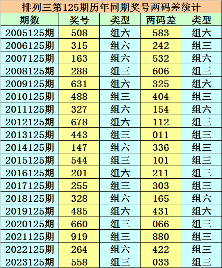 在排列三第125期历史同期开奖中,各号码两码差分别为:358、224、235、066、235、044、145、112、011、336、011、112、033、156、134、066、088、224、033;