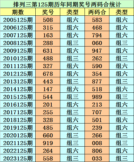 排列三从2004年开奖至今已开出6896期奖号了,其中第125期历史同期奖号出现19次,历年第125期分别开出号码:508、315、163、288、631、488、327、678、443、147、544、201、255、328、485、660、919、264、558。