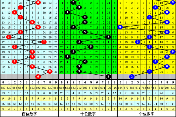 末位跨度分析:前3期末位奖号为6-8-5,最近两期末位奖号跨度为2、3,末位奖号跨度历史上连续两期开出2、3的现象共162次,其最近两次奖号为: