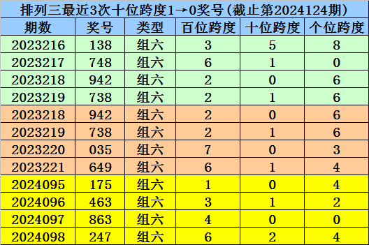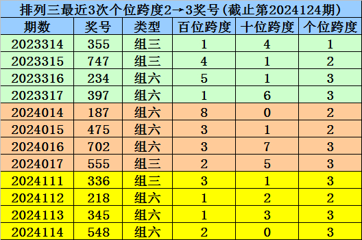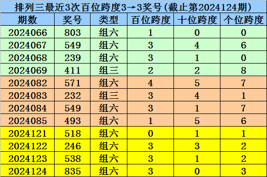 第2024121-第2024123期奖号:518、246、538,其下期奖号为:835,首位号码跨度为3;