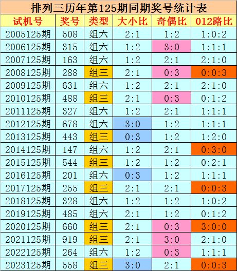 组选类型推荐:历史上排列三第125期同期奖号中,组六出现11期,组三出现8次,今年第125期预计奖号为组六号码。