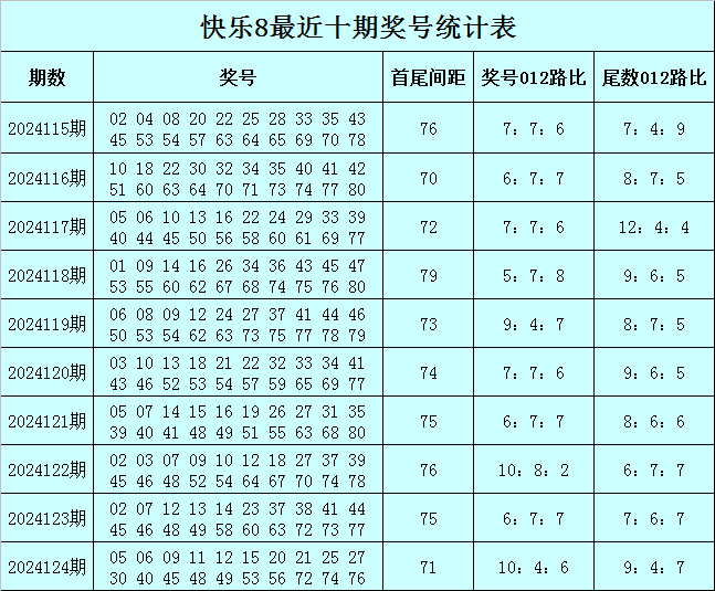 福彩快乐8第2024124期开出奖号:05 06 09 11 12 15 20 21 25 27 30 40 45 48 49 53 56 72 74 76,其中奖号012路比为10:4:6,尾数012路比为9:4:7。