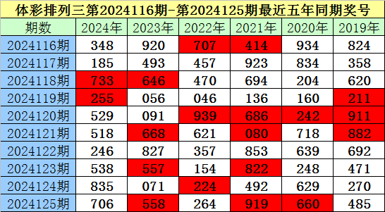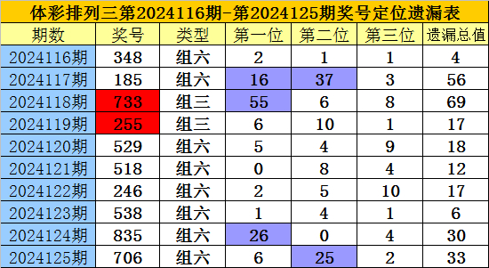 开奖回顾:排列三第2024125期奖号为:706,各位号码遗漏值分别为6、25、2,遗漏总值为33。