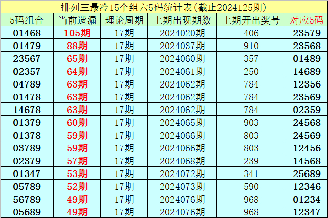(4)排列三第2024125期遗漏值最大的十个5码组六组合解冻了7个;