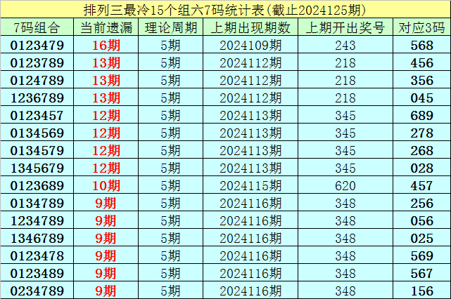 (1)在排列三已开出的6897期奖号中(统计截止第2024125期),目前7码组六遗漏值最大的组合为:0123479,本期遗漏16期;