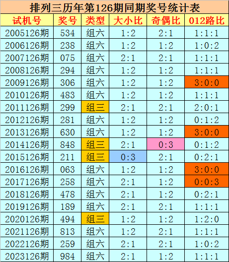 组选类型推荐:历史上排列三第126期同期奖号中,组六出现15期,组三出现4次,今年第126期预计奖号为组六号码。