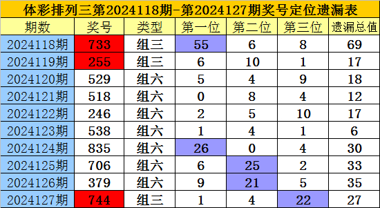 开奖回顾:排列三第2024127期奖号为:744,各位号码遗漏值分别为1、4、22,遗漏总值为27。