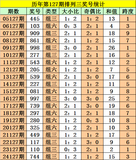 排列三第2024127期奖号:744,和值15,跨度3,大小比1:2,奇偶比1:2。