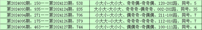 统计排列三已开出的奖号发现,在连续5期(第2024092期-第2024096)奖号为:150-935-271-175-463。