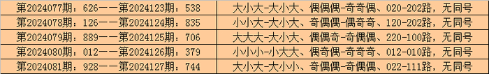 在排列三历史开奖中,第2024077期-第2024081期连续5期奖号为:626-126-889-012-928。